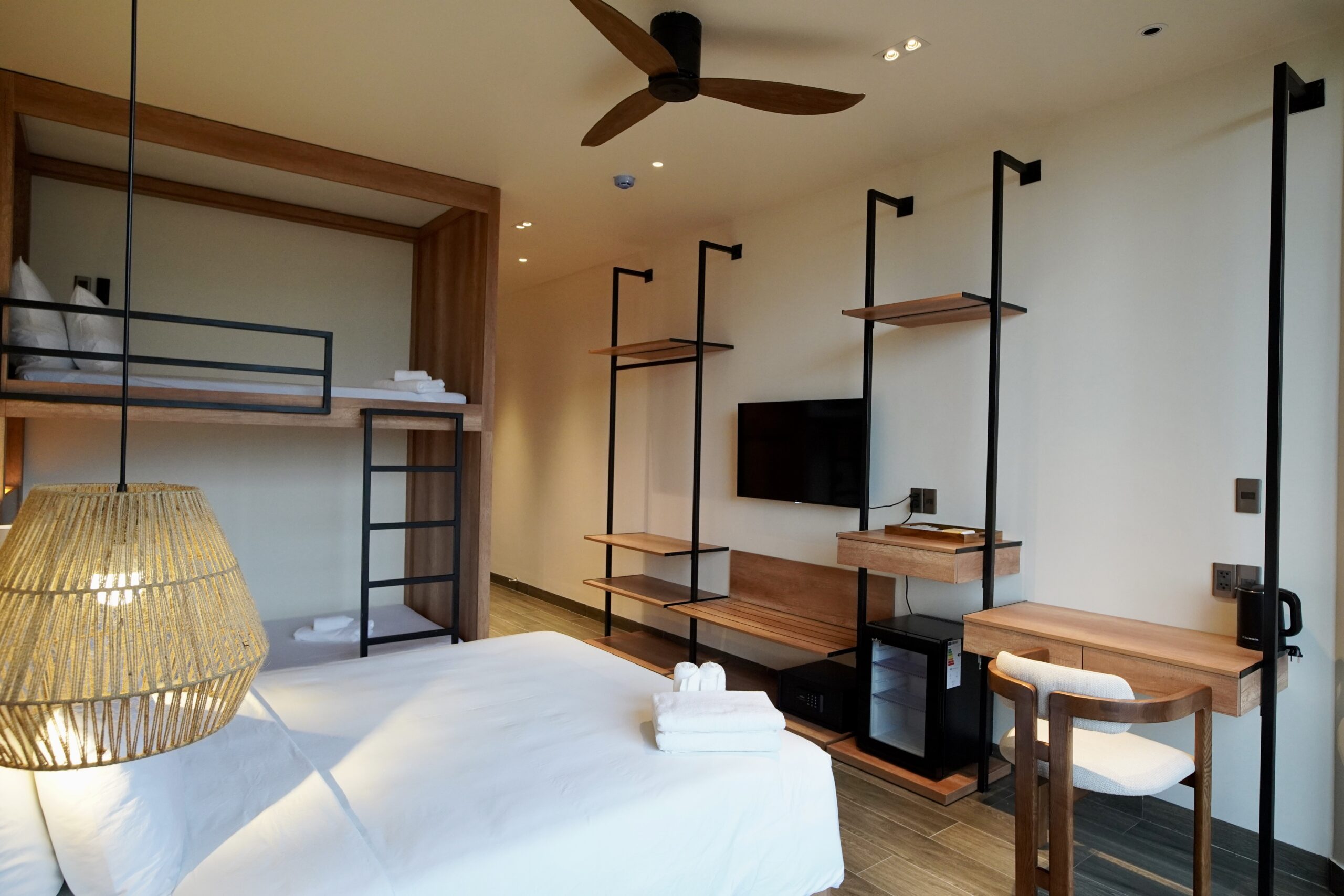 Căn phòng 28m² được thiết kế thông minh với 1 giường Queen và 1 giường tầng, mang đến sự tiện nghi cho nhóm bạn hoặc gia đình nhỏ. Không gian ấm cúng, hiện đại cùng cách bố trí tinh tế giúp tối ưu diện tích, tạo cảm giác thoải mái và gần gũi cho mọi thành viên.